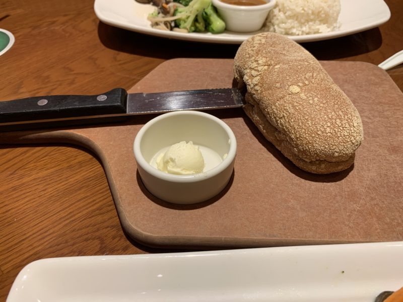 娘にはキッズメニューを。私は週末メニューというのがあったので、そこから、ステーキ&ハンバーグセットを注文しました。まずは、セットに付いているハニーブレッドというもの。おかわり自由です。うん、娘もがっつく程の美味しさ。