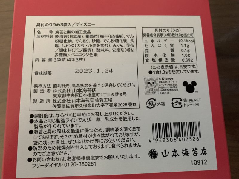 当たり前ですけど、Rawiは興奮。すぐに手に取り、これ欲しいと言い出しました。そりゃそうだよね。Rawiは海苔も好き。ミニーと海苔の好きなものが一緒になっているのだから。ご飯も食べるだろうと思って買ってあげることに。ただ、梅味なんだよな。ちなみに後ろ側はこんな感じ。